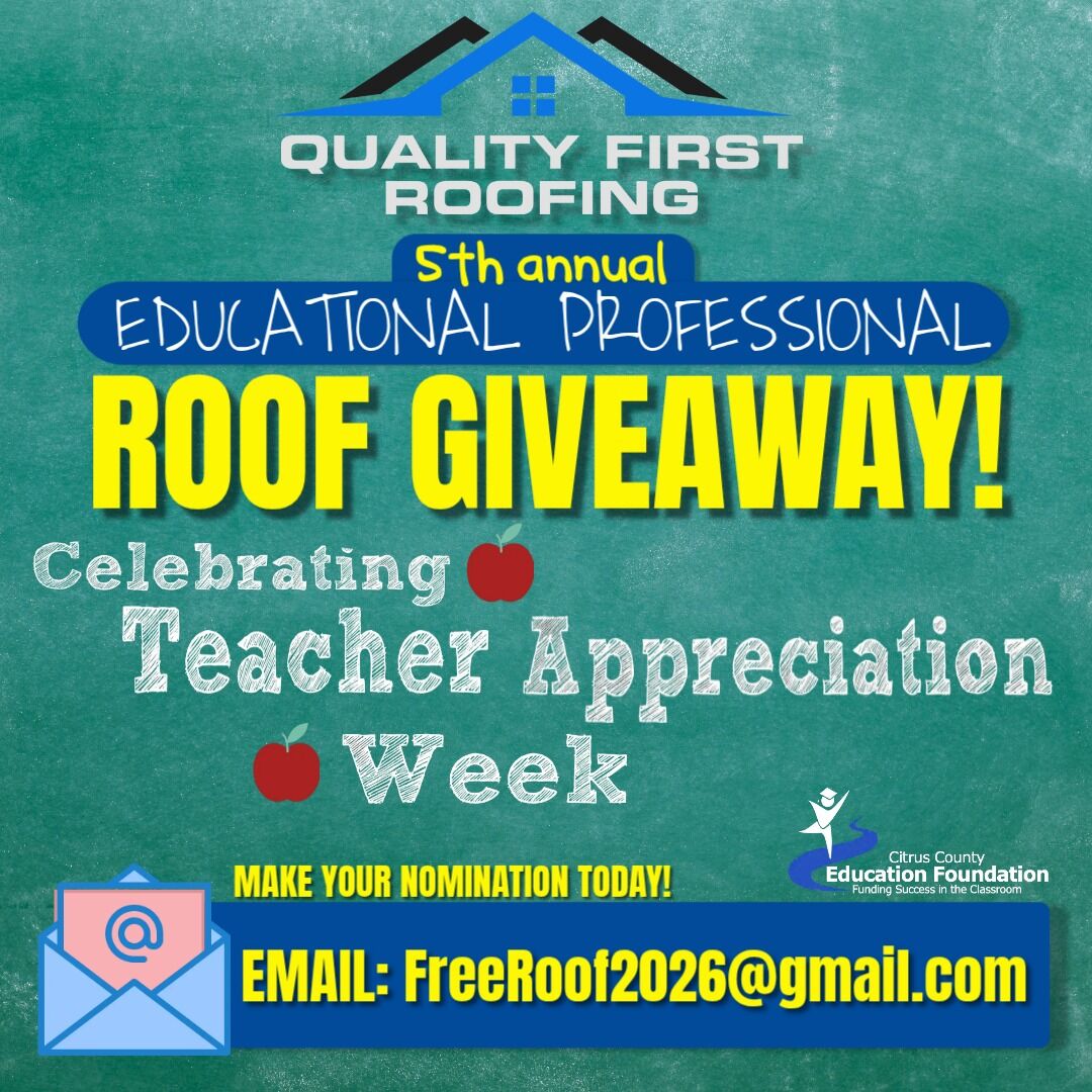 Sharing to our employees from our friends at Quality First roofing: It's that time again!!!! Who is your favorite local educator? Do they deserve to win a HUGE PRIZE?!? With National Teacher Apprec...