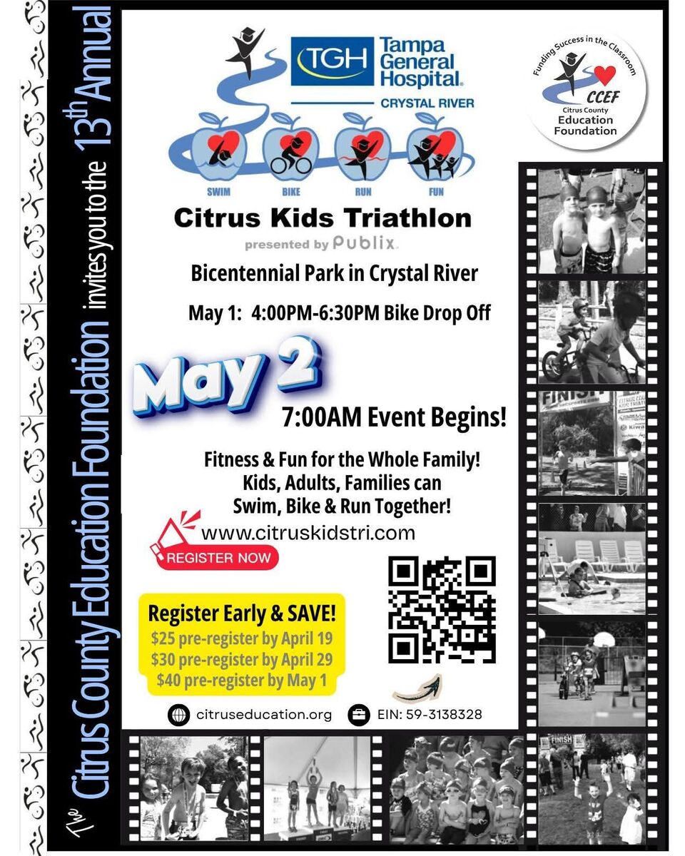 Please join us at the TGH Citrus Kids Triathlon Saturday May 2nd at Bicentennial Park in Crystal River, featuring • Junior & Senior divisions for kids ages 5-15 • Tri4Fun division for all ages & ab...